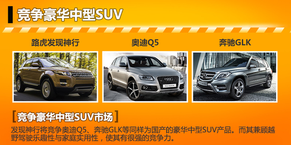 在竞争对手方面,发现神行在上市后将与已经国产的奥迪Q5、奔驰GLK车型产生竞争,在尺寸方面新车与竞争对手相比丝毫不落下风,同时独特的7座布局设计让这款车成为该细分领域中唯一的7座SUV,这样的设计将更能满足家庭用车的需求。由于路虎品牌一直以生产优秀的SUV产品得名,在SUV市场有着超高的人气,未来该车的上市将会助力路虎继续在SUV市场保持领先地位。