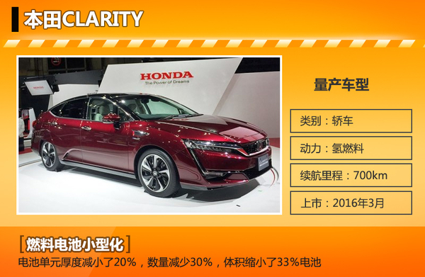 本田全新CLARITY的整体车身造型与比例延续了FCV概念车的设计,相比概念车型,量产版的设计更加稳重。新车采用燃料电池技术,与2008年发布的FCV“FCX CLARITY”相比,其最大的不同点是实现了燃料电池单元的小型化,其厚度减小了20%,数量减少30%,体积缩小了33%,续航里程将超过700km。新车预计于2016年3月在日本上市。值得一提的是,“CLARITY”这一名称也是在东京车展中首次发布。
