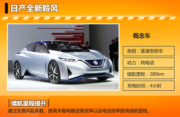 日产全新纯电动车型——聆风的外观和上代车型差异不大,较为明显的是轮毂造型的改变。而新车在续航里程上的升级更加引人注目。全新聆风有两种续航里程版本车型供选择,其中一款搭载了现款车型的24kWh电池组,可续航135km,而高配版本将会使用高容量电池组,续航里程达到280km。这主要是通过改善风阻系数、提高车载电器设备效率以及电池效率等多种手段实现的。在快充模式下,全新聆风一次充电可以在4小时内完成,在普通充电模式下则需要8小时。