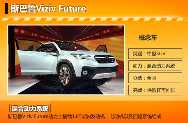 斯巴鲁Viziv Future概念车继承了斯巴鲁Viziv以及Viziv 2概念车的设计,搭载了一套混合动力系统,该系统是由一台1.6T柴油发动机、电动机以及四驱系统组成。值得一提的是,Viziv Future概念车进气格栅两旁便是造型犀利的头灯组;前保险杠两侧还装备有蜂窝状雾灯,个性化十足。后保险杠可以向外伸长,并可以携带两辆自行车。