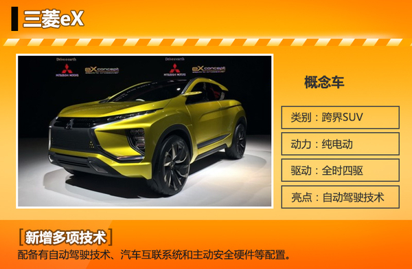 三菱eX SUV概念车在本届东京车展中首次发布,采用纯电动驱动系统并配备全时四驱系统。外观方面采用三菱家族式的设计风格,LED前大灯组造型格外犀利,前进气格栅采用黑色设计并搭配镀铬饰条修饰;车身侧面采用了极具棱角的流线形设计,悬浮式车顶设计看起来非常时尚。此外,尾部线条和LED尾灯组与前脸相呼应,带来大气而不失稳重的视觉效果。