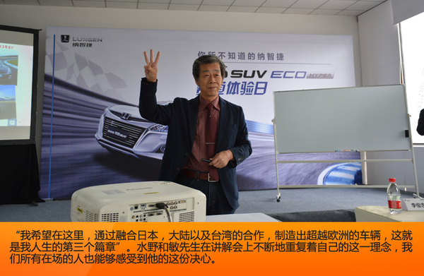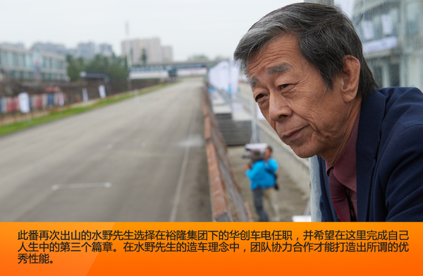 水野先生于2013年退休,直到裕隆集团在2014年力邀其担任旗下子公司华创车电的资深副总,此番再次出山,水野先生也是希望能够在此完成自己人生的第三个篇章,那便是集合日本,大陆以及台湾三地的智慧,打造出真正意义上超越欧洲品牌的车辆。在水野先生的造车理念中,团队协力合作是主要的原则,就像车辆一样,需要发动机、变速器、底盘、悬挂、轮胎等等部件的协同工作才能达到所谓的优秀性能,只有各个部门通力合作,才能研发出所谓的富含“乐趣”的汽车。