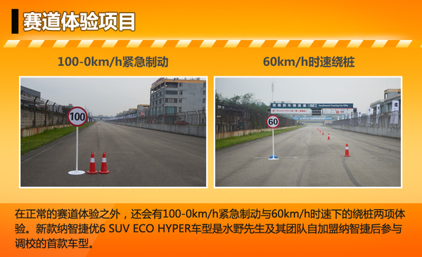 在水野先生的另一大造车理念,便是“以赛道为师”,在这种严苛赛道条件下整合调校出来的车,想必定是有着其过人之处的。在经过主办发分组后,赛道体验的环节也就正式开始了。期间有机会体验纳智捷优6 SUV 2014款以及纳智捷新款优6 SUV ECO HYPER 2015款两款车型。在正常的赛道体验之外,还有会100-0km/h的紧急制动和时速60km/h的绕桩体验。新款优6 ECO HYPER车型是水野先生及其团队自加盟纳智捷后参与调校的首款车型,区区数月的调校,就敢拿新旧两款车型在赛道上做对比体验,由此可见厂家对于车型真可谓是信心满满。