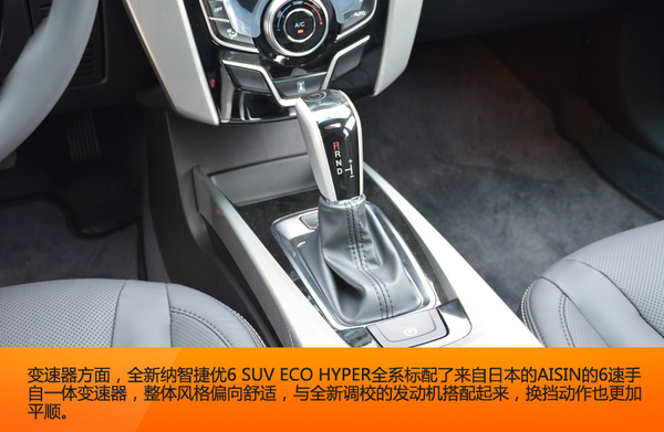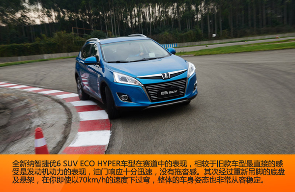变速器方面,全新改款的纳智捷优6 SUV ECO HYPER全系标配了来自日本AISIN的6速手自一体变速器,风格偏向舒适性,与发动机搭配起来,换挡动作也更加平顺。全新车型优化了动力总成以及底盘悬架,其实际表现便可在赛道中一探究竟。