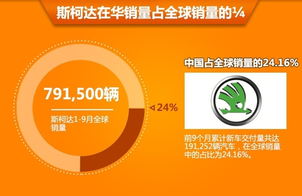 斯柯达今年9月份单月全球销量为9.36万辆,与去年同期相比下滑2.1%,这也是自从7月份连涨趋势中断后,单月销量再次下滑。近日,网通社从斯柯达中国官方获悉:今年1-9月份斯柯达前三季度向全球消费者共交付汽车791,500辆,同比增长2.2%。同期销售收入增长5.7%,达到93亿欧元。值得关注的是,斯柯达1-9月的在华交付辆达191,252辆,占全球销量的24.16%。