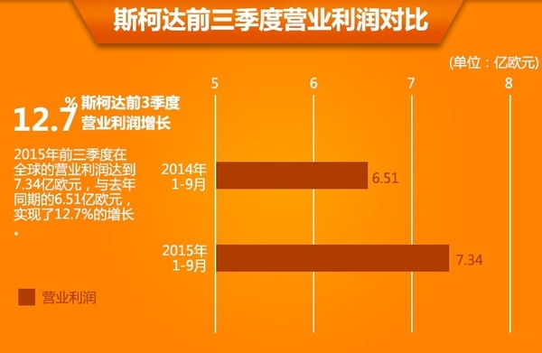 除了销量方面的增长,斯柯达在营业利润方面同样出现盈利性增长。2015年前三季度在全球的营业利润达到7.34亿欧元,与去年同期的6.51亿欧元,实现了12.7%的增长。对于增长的原因,原材料成本的下降是其中之一,此外,汇率的变化也对营业利润产生了积极的影响。