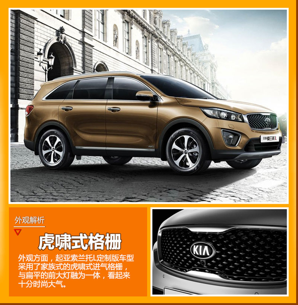 外观方面,起亚索兰托L有一定的突破,前脸延续了彼得希瑞尔的虎啸式格栅造型,但更为宽大圆润的轮廓造型削弱了逼人的锐气,显得更加时尚大气。外围是微微前凸的镀铬边框,与扁平犀利的前大灯融为一体。前大灯与格栅融为一体,采用双透镜灯组,大灯上沿是充当日间行车灯的LED灯眉。此外,大尺寸形状不规则的雾灯、经过重新调整的保险杠、黑色包围和银色下护板等SUV元素都充分展现了新车动感前卫的造型设计。