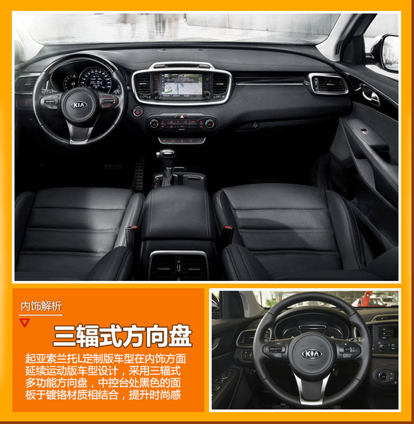 在内饰方面,索兰托L定制版延续了运动版车型的设计风格,中控台采用了大量的弧面,黑色的面板与银色的镀铬边框进行搭配,并加入木纹进行装饰点缀,在体现时尚感的同时做工十分精致。三幅式多功能方向盘与集成GPS导航系统以及多媒体信息娱乐系统的大尺寸液晶显示屏想配合,操控直观、方便。
