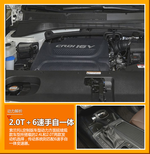 在动力方面,起亚索兰托L定制版车型将搭载两款汽油发动机,分别为2.4L自然吸气发动机和一款2.0T涡轮增压发动机。其中2.4L发动机最大功率为138kW,峰值扭矩则是241Nm;2.0T发动机其最大输出功率为177kW,峰值扭矩达到350N/m,为新车提供了更加强劲的动力。与发动机相匹配的是一款6速手自一体变速器。