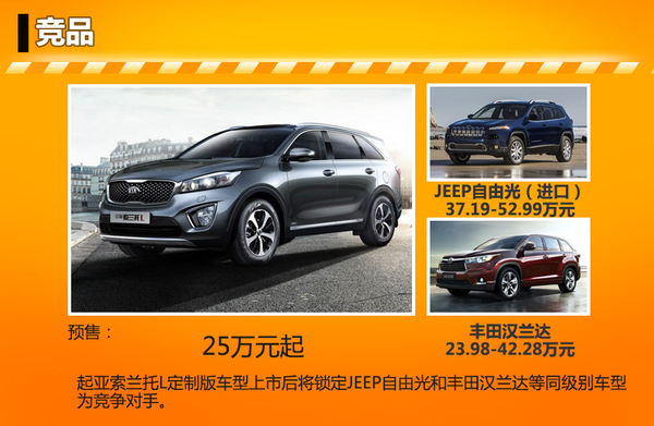 目前在中型SUV市场中,JEEP进口自由光和丰田汉兰达有着十分不错的市场表现。现款JEEP进口自由光售价区间为37.19-52.99万元,现款索兰托L起售价格为23.78万元,这一价格在同级别车型中极具优势。值得一提的是,索兰托L定制版是基于现款运动版车型打造的,新车型的加入将进一步扩充产品序列,也将为消费者提供更多选择。