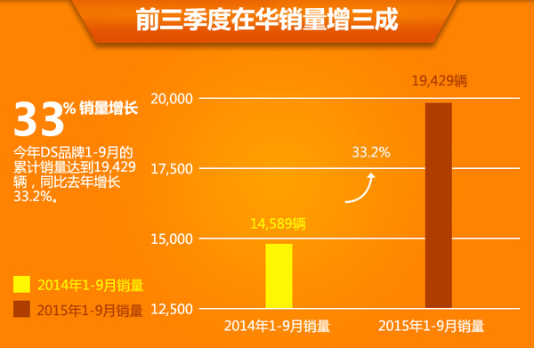 市场表现方面,今年DS品牌在华1-9月的累计销量达到19,429辆,相比2014年同期的14,589辆,实现了33.2%的增长。“目前,DS已有87家经销商,月销量从年初的1,500台提升到现在的3,000台以上,今年年底计划达到月销量4,500至5,500台。”PSA DS品牌中国及东南亚地区总裁兼长安PSA DS品牌总经理陈国章陈国章向网通社介绍到,DS品牌凭借电商等方式的帮助,使得今年在华月销量明显提速,如年底能够达到月销量4,500-5,500台预期的话,明年DS品牌在华销量将持续攀升,继续成为豪华品牌中销量增速最快的车企。
