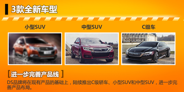 目前DS品牌在华的产品序列中,紧凑级轿车产品阵营丰富。SUV方面推出了一款紧凑型SUV DS6。据了解,DS品牌未来将进一步丰富产品布局推出多款新产品,其中包括C级轿车、中型SUV以及小型SUV等多款全新车型。而旗舰级轿车、SUV的推出也将进一步提升DS品牌竞争力与知名度。随着DS品牌产品线的不断完善,DS品牌在华发展速度也将进一步加快。
