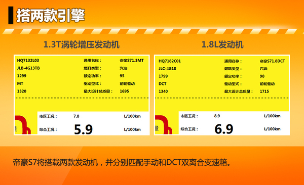 帝豪S7搭载的1.8L发动机型号为JLC-4G18,与现款经典帝豪搭载的1.8L发动机保持一致,最大功率为98kW,分别匹配手动和DCT双离合变速箱,百公里综合油耗为6.9L。