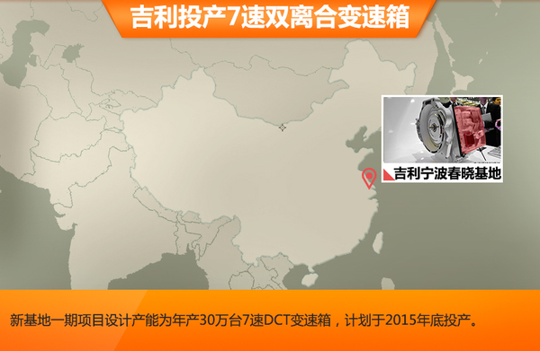 新车搭载的7速DCT双离合变速箱将由吉利宁波北仑春晓基地投产,该项目总投资27亿元,其一期项目于2013年5月开工建设,此后由于生产工艺调整,地面建设暂停。2014年6月,该项目重获宁波市发改委立项,当年6月底复工。该项目将分两期建设。一期项目设计产能为年产30万台7速DCT双离合变速箱,计划于2015年底建成投产。