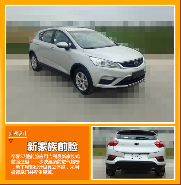 帝豪S7整体造型设计趋向城市化两厢轿车造型,前脸应用了吉利汽车最新家族式前脸造型——水波涟漪前进气格栅,并与双侧头灯组采用一体化线条,符合当下新车时尚设计理念。新车尾部设计极具立体感,采用掀背尾门并配备尾翼。该车反光条区域采用哑光材料装饰,形成空气动力学套件般的视觉效果,为车尾造型设计增色不少。新车配备的双边共两出镀铬式尾排也是新车尾部设计的一大亮点。