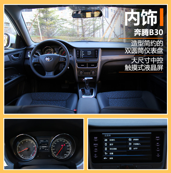 内饰方面设计简约,同时不乏科技感和运动感。经典的T型仪表台、筒式组合仪表、三辐运动式多功能方向盘,给人强烈的驾驶欲望,全系采用超大7英寸彩色多功能显示屏,可以满足驾驶员及乘客的各种需求。同时奔腾B30还拥有舒适宽敞的驾乘空间,为消费者提供更好的驾驶体验。