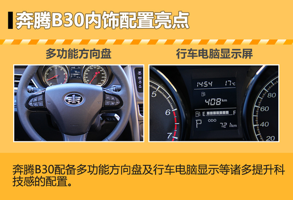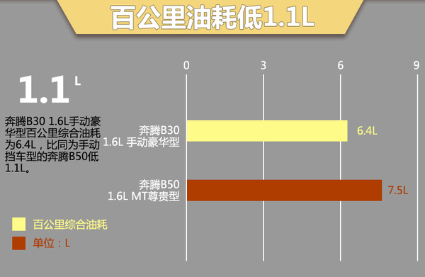 写在最后:奔腾B30在车身尺寸、动力性能方面相比奔腾B50略有提升,并且百公里综合油耗低了1.1L。从对比的两款车型来看,奔腾B30 1.6L手动豪华型相比奔腾B50 1.6L MT尊贵型售价低了2.8万元,但配置表现已十分接近后者,体现出不错的性价比,十分适合该预算区间的用户群。