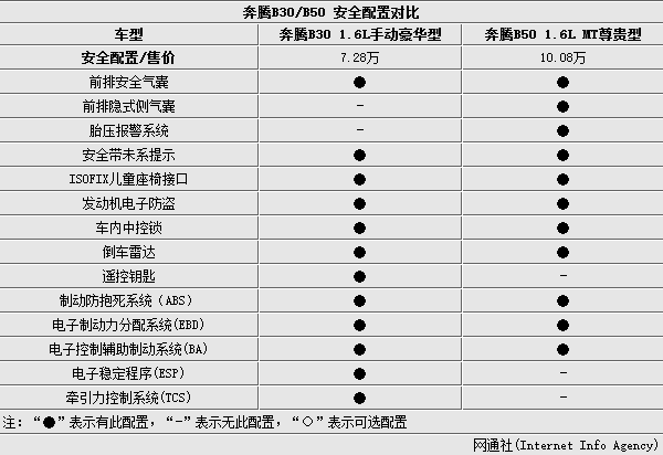 从上表不难看出,奔腾B30安全配置均十分丰富,充分体现出厂家的诚意。其中新增的电子稳定程序、牵引力控制系统等电子安全系统实现全系标配,以科技手段提升行车安全性能。值得一提的是,两者均配备的倒车雷达、安全带未系提醒、儿童安全座椅接口等功能均是实用性较强的安全功能,也能提升整车在同级产品中的竞争力。
