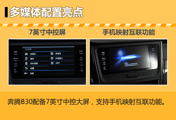 奔腾B30的一大亮点就是全系标配了7英寸中控彩色大屏,并配备智能人机交互系统可实现手机映射互联功能,此外新增的蓝牙车载电话也是日常驾驶较为常用的功能,操作更加便捷的同时也提升了行车过程中的安全性。另外两车配备日间行车灯并可实现大灯高度可调,体现出在光源设计方面的科技感。