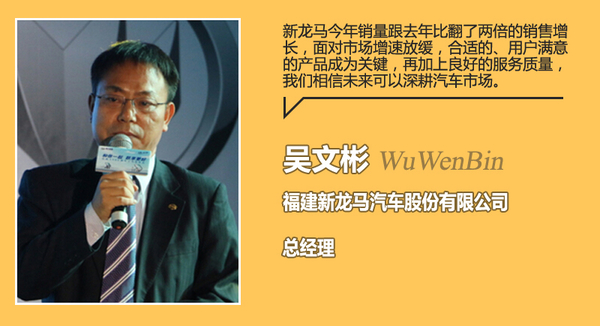 自2015年汽车市场整体表现增速放缓后,较多车企在销量上并没有达到预期。新龙马选择在此时进入乘用车市场,先后推出了微客和MPV车型,而明年的三款新车也在紧锣密鼓的筹备当中,新产品的投放是否会给企业带来更好的较量表现。对此,福建新龙马汽车股份有限公司总经理吴文彬有着自己的见解,“新龙马今年销量跟去年比翻了两倍的销售增长,面对市场增速放缓,合适的、用户满意的产品成为关键,再加上良好的服务质量,我们相信未来可以深耕汽车市场。”