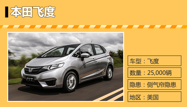| 本田 | 飞度 | 25,000辆 | 2014年4月11日到2015年7月2日 | 侧气帘隐患 |