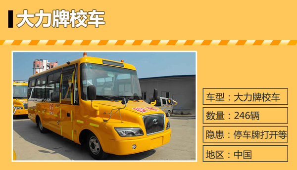 | 大力汽车 | 大力牌校车 | 246辆 | 2013年至2014年 | 存在多项缺陷 |