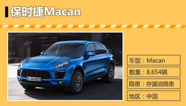 | 保时捷 | Macan S | 8,654辆 | 2014年03月至2015年10月 | 存在漏油隐患 |