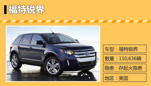 | 福特 | 锐界 | 110,636辆 | 2008年9月11日至2010年7月1日 | 漏油起火隐患 |