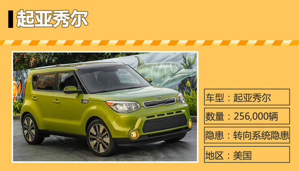 | 起亚 | 秀尔 | 256,000辆 | 2014至2016 | 转向失灵隐患 |
