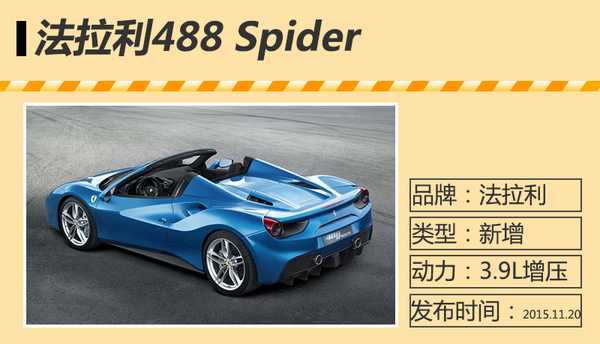 488 Spider是以488 GTB为蓝本打造的全新敞篷跑车,新车在今年9月开幕的法兰克福车展上亮相,并将于本月登陆中国市场。该车是继458 Spider之后法拉利第二款可折叠硬顶敞篷的中置后驱超跑,由于换搭了3.9L“小排量”引擎,新车入华后随着排量的降低消费税率也将相应大幅降低。