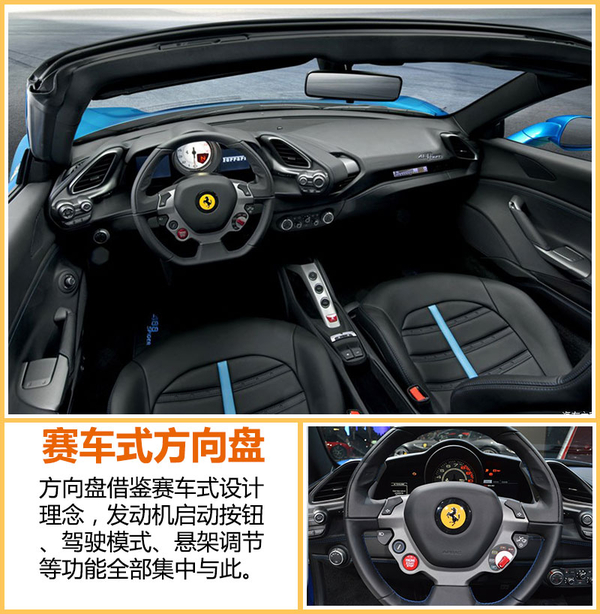 在内饰方面,法拉利全新硬顶敞篷车的设计风格也与488 GTB保持一致。方向盘借鉴赛车式设计理念,发动机启动按钮、驾驶模式、悬架调节等功能全部集中与此,使得驾驶更加便捷。此外,新车采用传统样式的转速表,并在其右侧安装多媒体系统显示屏,显示了488 Spider的运动基因。