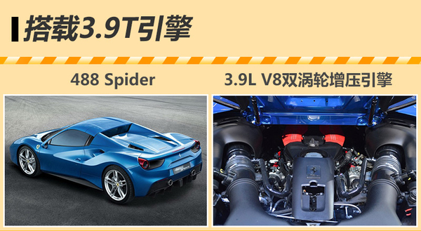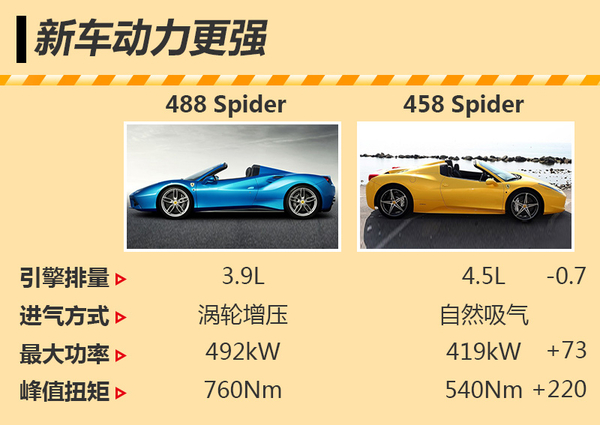 在动力方面,法拉利488 Spider所搭载的3.9L V8双涡轮增压引擎,虽然排量小于上代车型法拉利458 Spider所搭载的4.5L V8自然吸气引擎,但动力性能与之相比却有很明显的优势。458 Spider的最大功率为419kW,峰值扭矩为540Nm。而488 Spider搭载的3.9T引擎最大输出功率可达492kW,峰值扭矩可达760Nm,在参数上均大幅超过4.5L引擎。在传动方面,与3.9T引擎匹配的是一台7速双离合变速箱。得益于强劲的动力,新车在3s内即能实现百公里加速。