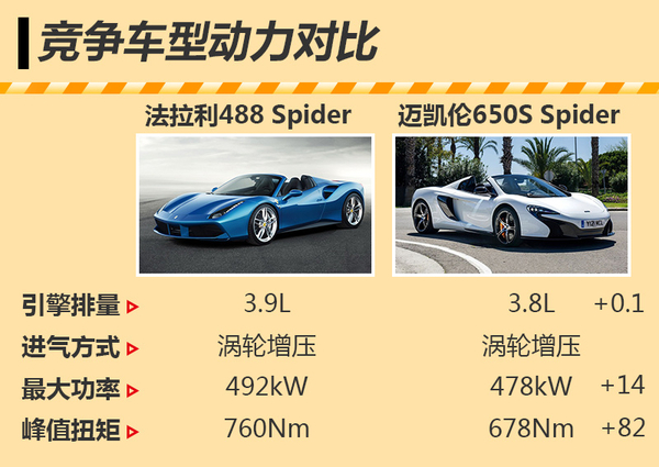 作为法拉利的直接竞争者,搭载3.8T引擎的迈凯伦650S Spider超跑已在华上市。在动力方面,法拉利488 Spider所搭载的3.9T引擎在排量上与650S Spider基本一致,但最大功率却较650S Spider高出14kW,峰值扭矩则高出82Nm。凭借着年轻化的造型和强劲的动力输出,法拉利全新硬顶敞篷车将在与迈凯伦650S Spider的较量中获得优势。