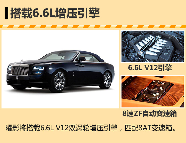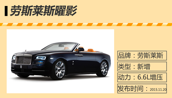劳斯莱斯2014年销量突破4000辆大关,创造了史上最佳销售记录。为了进一步提升市场竞争力,劳斯莱斯将眼光转向能吸引年轻客户的敞篷车型上,推出了全新敞篷车—曜影,该车于今年的9月全球首发,并将于近期在国内发布。近日,网通社从劳斯莱斯官方获悉,劳斯莱斯曜影将在本月20日的广州车展上进行中国首发。动力方面,新车将搭载6.6L V12双涡轮增压引擎,最大功率可达420kW,0-100km/h加速时间仅为4.9秒。作为劳斯莱斯旗下的四座豪华顶级敞篷车,曜影在上市后将同步进入中国市场。