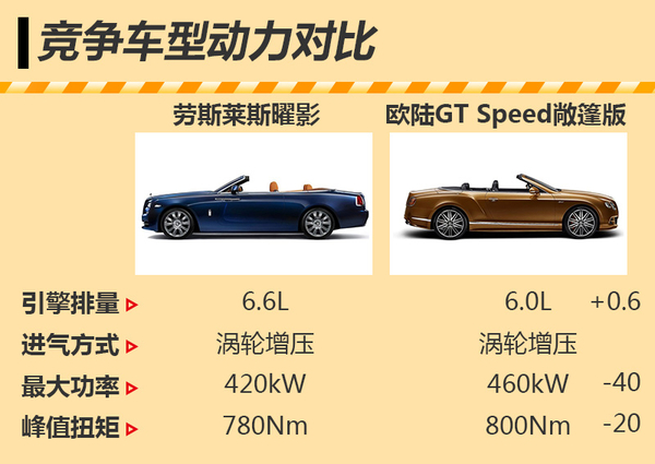 在超豪华领域中,宾利一直是劳斯莱斯的直接竞争对手,劳斯莱斯此次推出的全新敞篷车曜影也将目光瞄准宾利的欧陆GT Speed敞篷版。欧陆GT Speed敞篷版目前搭载的是6.0L V12双涡轮增压发动机,最大功率为460kW,峰值扭矩为800Nm。相比之下,尽管曜影搭载的6.6L V12双涡轮增压引擎在最大功率上稍逊一筹,但二者在峰值扭矩上则旗鼓相当。凭借着年轻化的造型和强劲的动力输出,劳斯莱斯曜影将在与宾利欧陆GT Speed敞篷版的较量中获得优势。