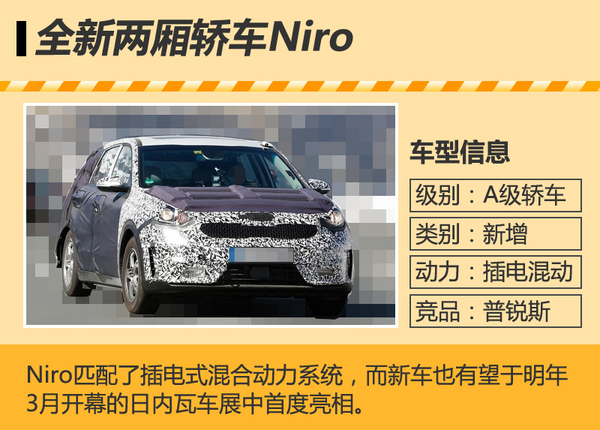 在新能源车型方面起亚还将推出全新紧凑级两厢轿车Niro,这款具有跨界车元素的全新产品在动力总成中将搭载一款排量为1.6L的自然吸气发动机,并且匹配了插电式混合动力系统,新车也有望于明年3月开幕的日内瓦车展中首度亮相。起亚全新Niro在外观方面采用了跨界车的设计元素,新车是基于2013年在法兰克福车展上发布的Niro概念车为蓝本打造,而就设计思路而言,该车借鉴了起亚秀尔与狮跑的外形风格,从而将两者结合,最终以全新平台打造这款插电式混合动力跨界车。