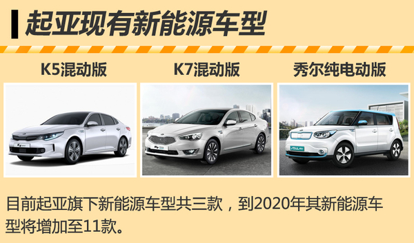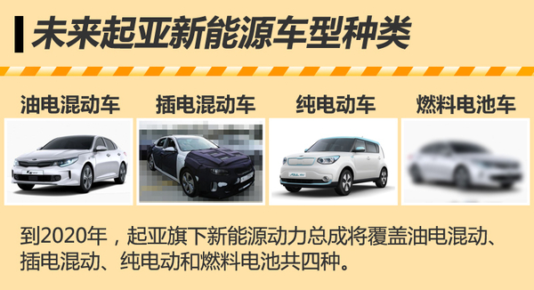起亚将投资102亿美元,在未来5年打造更多新能源车型,到2020年新能源车将达到11款。11款新能源车将涉及各种动力总成,包括油电混动、插电混动、纯电动以及燃料电池。起亚环境友好汽车研发中心高级副总裁Ki-Sang Lee曾表示“我们不相信靠着一款‘银色子弹’就可以满足汽车行业对低排放技术的需求,因此我们打算在一段时间内使用一系列环保动力总成。”起亚计划到2020年推出一款氢燃料电池车,目标是将CO2排放量降低25%,待其2020年量产后预计年销量目标为1000辆,新车竞争对手瞄准了丰田Mirai。