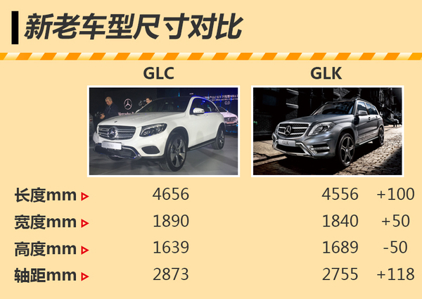 北京奔驰GLC没有选择对其海外车型进行加长,长宽高依旧是4656/1890/1639毫米,轴距为2873毫米。即便如此,国产奔驰GLC的尺寸与现款北京奔驰GLK相比仍加大了不少,其中车长和轴距分别增加了100毫米和118毫米,车内乘坐和使用空间会有较为明显的改善。