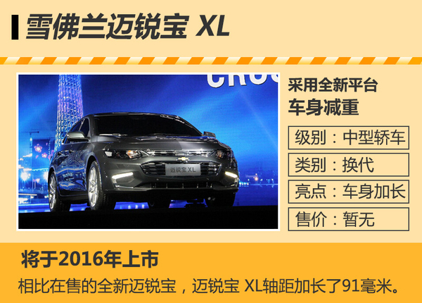 雪佛兰迈锐宝是通用汽车着力打造的中级轿车。今年10月,全新迈锐宝正式上市,明年还将在华推出换代产品,中文名为迈锐宝XL。上汽通用总经理王永清透露,第九代迈锐宝将会与现款全新迈锐宝在中国市场同堂销售。相比全新迈锐宝,迈锐宝XL轴距加长了91毫米,更利于车内后排乘坐空间的优化。