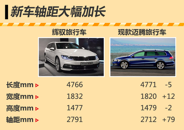 源自于B8平台的全新迈腾旅行轿车已在广州车展正式发布,该车将成为大众B8系列引入中国市场的首款车型,并命名为辉驭旅行轿车。与现款迈腾旅行轿车相比,新车的轴距加长了79毫米。将近一拳的轴距扩展,将明显增加车辆前、后排的腿部空间,从而使新车的驾乘舒适度得到有效提升。