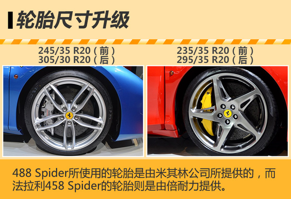 在机械配置方面,由于法拉利488 Spider所搭载的是功率及扭矩更为强劲的双涡轮增压引擎,因此在轮胎的尺寸上也进行了相应提升。此外,法拉利488 Spider所使用的轮胎是由米其林公司所提供的,而法拉利458 Spider的轮胎则是由倍耐力提供。