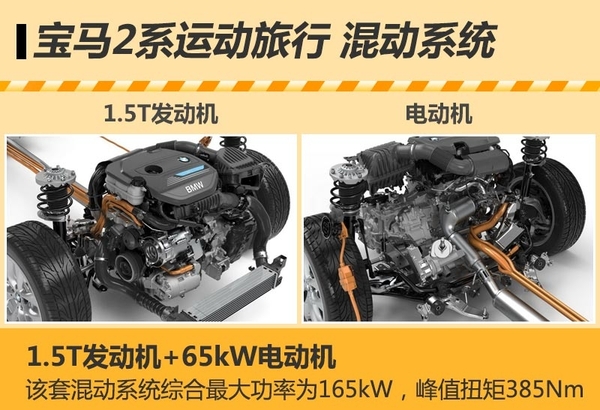 该车的混动系统是由宝马最新研发的1.5T发动机和一款动力输出可达65kW和165N•m电动机组成,当发动机和电动机同时做功时,这套插电式混合动力系统的综合最大功率为165kW,峰值扭矩达到385N•m,而百公里综合油耗仅在2L左右。