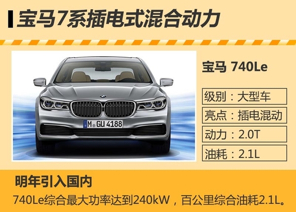 新一代7系刚刚在国内上市,而7系的插电混动版(740Le)有望于明年引入国内。740Le采用最新的宝马家族式设计风格,外观上基本与全新7系一致,进气格栅和前大灯处增加的蓝色线条,以证明其插电混动的身份。新车上搭载的一套由2.0T发动机与电动机组成的插电式混合动力系统,综合最大功率达到240kW,纯电动驱动可行驶40km,百公里综合油耗仅2.1L。