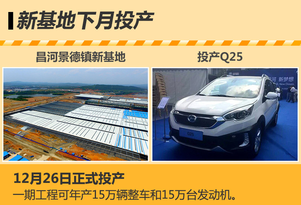 未来昌河汽车生产基地将分别设在江西的九江和景德镇。其中北汽昌河景德镇新基地项目于去年7月奠基,该项目总投资140亿元,全部建成后可达到年产45万辆整车、30万台发动机的规模,基地产品包括交叉型乘用车,小型、紧凑型至中型轿车,SUV,MPV和新能源汽车等级别车型。其中一期工程可年产15万辆整车和15万台发动机,全新小型SUV——Q25将在此生产制造,新基地将于今年12月26日正式竣工投产。