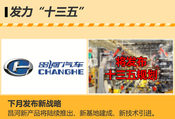 按照昌河方面预计,今年旗下汽车销量将达到10多万辆,公司下一阶段产品类型都已规划完毕,并将在下月正式发布“十三五”战略规划。廖雄辉表示,作为“十三五”的开局之年,明年将是昌河汽车全面发力的一年,战略举措将包括新产品将陆续推出、新基地建成、新技术引进,包括涡轮增压发动机的引进、消化、吸收等。