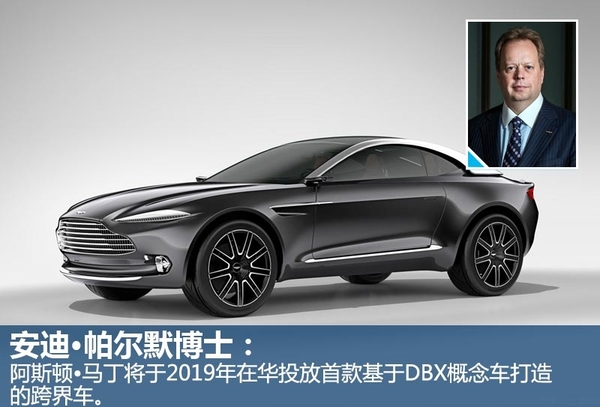 阿斯顿•马丁刚公布了未来几年在中国的产品规划,在新车方面面将先后推出6款全新或换代车型。面对SUV市场已成为目前国内增速最快的一大细分领域,阿斯顿•马丁将向中国推出首款跨界SUV。对此,阿斯顿•马丁有限公司首席执行官安迪•帕尔默博士(Dr. Andy Palmer)向网通社透露:“阿斯顿•马丁将于2019年在华投放首款基于DBX概念车打造的跨界车。”值得一提的是,这款跨界车将是一款专为中国市场打造的车型。
