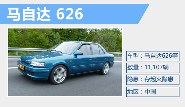 | 马自达 | Mazda 323(BG型号) | 11,107辆 | 1992年6月1日至1998年7月30日 | 存在起火隐患 | |
