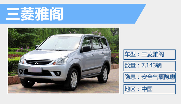 | 三菱 | 君阁 | 7,143辆 | 2008年1月15日至2011年12月31日 | 安全气囊隐患 | |