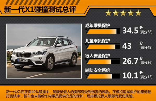X1是宝马旗下入门级SUV,全新一代车型已于近日在海外上市。新车基于最新研发的UKL前驱平台打造,和现款车型相比,新一代X1采用了全新前后保险杠造型,设计更加运动和前卫,并且空间与动力方面也有较大提升。全新X1将由华晨宝马进行投产,并有望在明年初投放国内市场。在安全方面,日前网通社从欧洲新车安全评鉴协会(E-NCAP )获悉:新一代宝马X1在该机构进行了碰撞测试,在正面100%碰撞以及侧面碰撞中能为车内假人提供到位的防护。但在正面40%碰撞中,车内驾驶员假人胸部有受伤风险;此外,该车在鞭打测试中,后排假人颈部有受伤风险。因此,在这两项碰撞测试中,新一代X1对乘员的保护还需进一步加强。