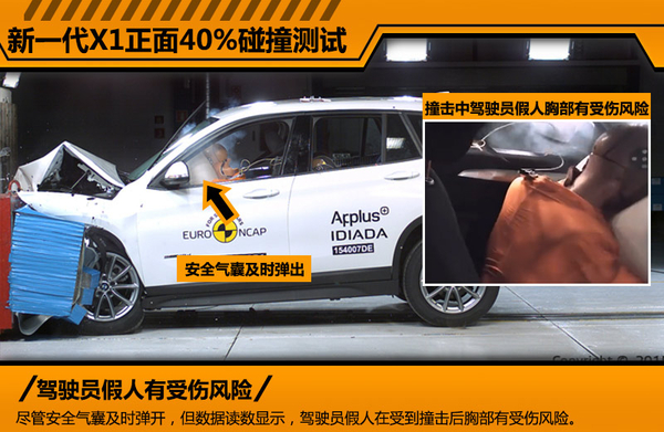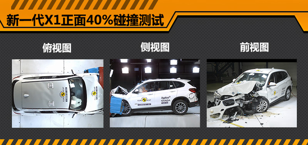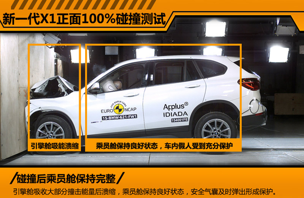 新一代X1在正面40%碰撞测试中,A柱无明显变形,驾驶舱基本保持良好的完整状态。撞击中安全气囊能及时弹开,为驾驶员和乘客的头部提供了充分的防护,假人的膝盖和股骨也受到良好保护。宝马表示,对于身材不等和坐在不同位置的乘员,此车提供的保护水平都是一致的。但数据读数显示,驾驶员假人在受到撞击后胸部有受伤风险,因而此项保护有待进一步加强。